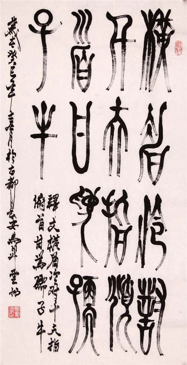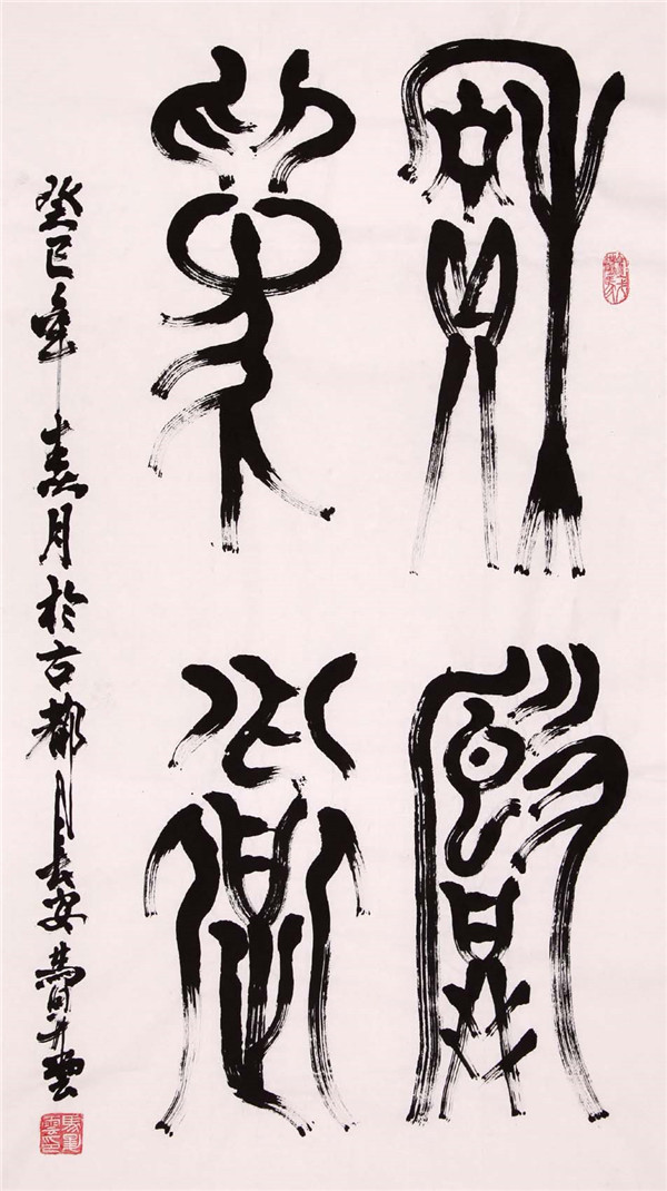马戈的书画根基深厚,师法自然,书法以篆为主,兼行、草、隶诸体,绘画喜墨竹怪石、素花仕女,作品古朴浑厚、沉雄劲健、气势逼人,耐人寻味,有一种引人入 胜的艺术魅力。尤其篆书,下笔重拙,行笔爽健洒脱,刚柔相济,如“锥画沙”,似“屋漏痕”,营造“飞白”的笔画之美,犹如悬崖瀑布飞纵,似快艇急驰水面; 施墨浓重,圆融流动,视觉冲击力、艺术感染力极强;结体巧妙,既求统一,又求多样,二者相辅相成;章法严谨,开合自如,虚实、节奏变化明显,黑白对比强 烈,有一种雄浑博大的气象。 欣赏马戈的作品如与其对饮,非“西凤”不能,醇香干洌,透入心肺,好似他的性格豪爽直率,畅快淋漓,犹如他的外形轮廓端端正正,大气浑厚中透出的一股书卷气。