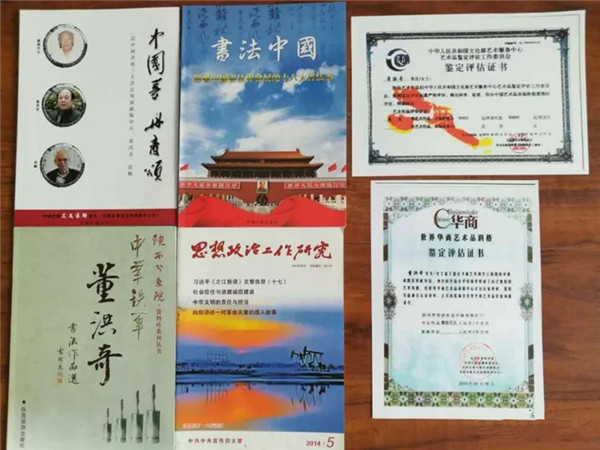 在纪念邓小平诞辰100周年全国名人书画大赛上,获得优秀奖荣誉证书。 2005年,在文化部归国华侨联合会主办的中国德艺双馨书法大赛成年组北京全国总决赛中,获唯一金奖及证书。 2006年10月3日,在"华夏魂"华人祭祖书画摄影艺术邀请赛中获金奖及证书。 2007年,在第二届华商领袖年会书画精品展中获二等奖及证书。 2008年,在中国芮城首届永乐宫国际书画艺术节获得优秀作品奖。 2012年9月19日,荣获中国(芮城)永乐宫第五届国际书画艺术节百佳奖。 2013年6月22日,荣获中国书画收藏频道中国当代书画名家著名书法家专题报道。 在西安用铁笔书法为胶片电影题写片名《无极》被正式采用。 2007年7月28日,在纪念傅山诞辰400周年活动中,他积极参与,义捐铁笔书法作品。 他和西安市花鸟画院院长、国家二级美术师赵瑞安分别向宁夏希望工程捐赠了5幅价值5万元作品。书画作品义卖后所得款项全部捐赠给贫困地区品学兼优的学生。 2008年,在山西太原,他还为四川汶川地震灾区儿童捐赠书法作品义卖款,被电视台报道。 在山西五台山,他曾为佛教寺庙拿起铁笔题写门牌匾额。 2008年,在西安市"迎奥运,树新风,交通安全走进长安"活动中,他以铁笔写下"平安交通"等作品,受到组委会一致赞扬及好评,被电视台新闻报道。 2008年,在山西迎奥运活动中,他专门以铁笔书法写下几十幅作品为奥运喝彩,为奥运加油,被电视台报道。 2011年3月,以铁笔书法作品积极参与并支持了山西农村广播《我的乡村情结》,获荣誉证书。 2011年8月6日,在纪念辛亥革命100周年海峡两岸百名将军书画展活动中,义捐作品两幅,获荣誉证书。 2012年5月5日,在北京石景山茂华大厦为中国德孝文化研究会义写铁笔书法作品,将被展挂于大厅。 2013年5月2日,在遵化市被清东陵皇家寺院隆福寺复建理事会和遵化市永昶旅游开发有限公司聘任为清东陵皇家寺院《隆福寺》复建理事会理事、复建领导小组成员、铁笔书法艺术文化顾问。 2014年1月11日,CCTV7【乡村大世界】农民手握铁笔 书写别样情怀(山东巨野 140111)节目纪录播映了他走进山东巨野农民书画之乡挥毫泼墨献艺之中华铁笔书法作品《浓墨重彩》。 上一篇中国著名书画家张大杰下一篇山水画画家常潇博士 |
